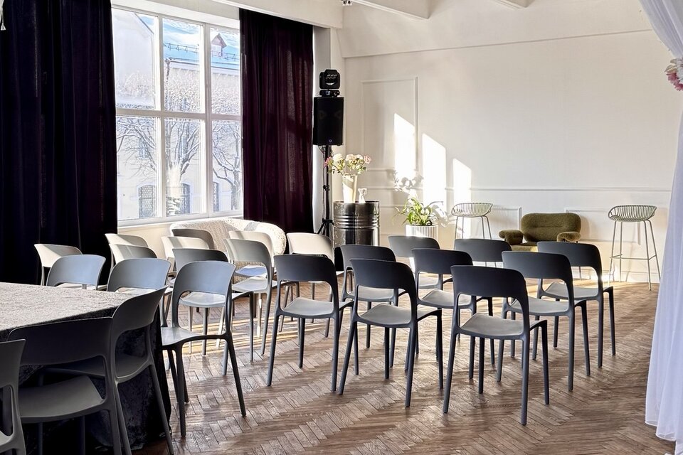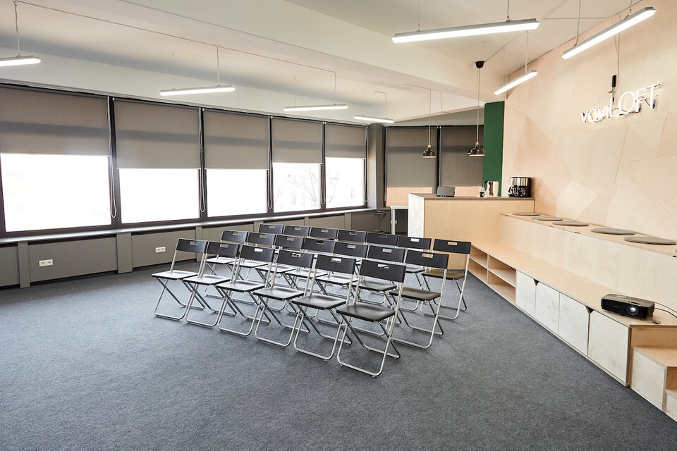 Конференц-зал/пространство «35» - это комфортабельный конференц-зал для проведения семинаров, мастер-классов, тренингов, презентаций вместимостью до 25 человек, оснащенный необходимым техническим оборудованием с мобильным зонированием пространства (перегородка для зонирования), кухней, отдельным гардеробным помещением (общей площадью 65,4 м2).Все стулья и столы легко убираются, либо можем расставить их в любом удобном для Вас порядке. У нас оборудована мини-кухня для кофе-пауз и перерывов, есть чайник, кофемашина и микроволновая печь. Помещение оснащено бактерицидным рециркулятором воздуха.На первом этаже здания имеется кафе с возможностью организации кофе-пауз и обедов.
