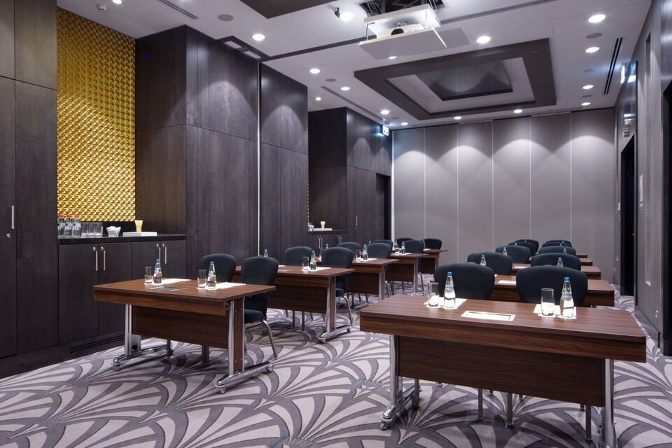 3 стильных и полностью оснащенных конференц-зала. Общая площадь — около 100 м2, вместимость — до 60 гостей). Все помещения располагаются на одном уровне с бизнес-центром, рестораном и фойе, что является неоспоримым преимуществом во время проведения кофе-пауз.У отдыхающих в gourmet-отеле есть возможность посетить фитнес-центр с профессиональными тренажерами, а также заказать блюда и напитки прямо в номер в любое время дня и ночи.