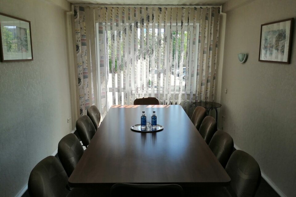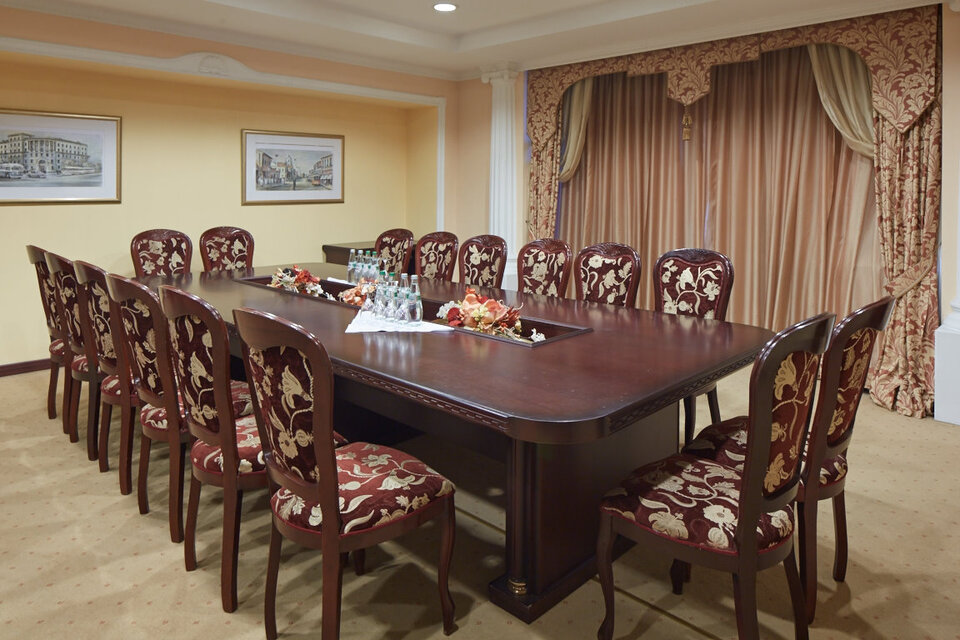 Самый строгий конференц-зал - "Председатель". Идеально подойдет для стратегической встречи или бизнес-переговоров. Интерьер зала включает в себя массивный стационарный стол для переговоров до 20-ти человек.При необходимости для гостей может быть организована кофе-пауза или бизнес-ланч. Фойе перед залом имеет собственный выход на улицу. Стоимость привязана к курсу доллара, окончательную сумму уточняйте при бронировании.
