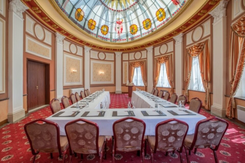 «Квин» ― самый элегантный и изысканный зал отеля. Этот роскошный зал с высоким сводчатым потолком, выполненным из мозаичного стекла, идеально подходит для проведения небольших торжественных мероприятий, выездных регистраций, а также практических семинаров, бизнес-встреч, презентаций, корпоративного бизнес-обучения. Зал «Квин» имеет овальную форму и рассчитан на 40-50 человек при театральной рассадке.Под куполом с античными фресками и лепниной царит атмосфера величественности и в то же время королевского уюта ― зал «Квин» вполне мог бы быть комнатой отдыха Её Величества. Убранство зала придаст торжественности маленькому празднику, а во время деловых переговоров наградит вас королевской уверенностью, что сделает любую сделку успешной.
