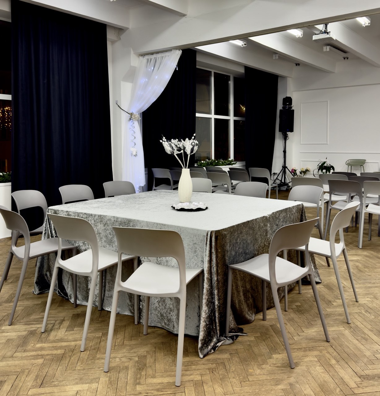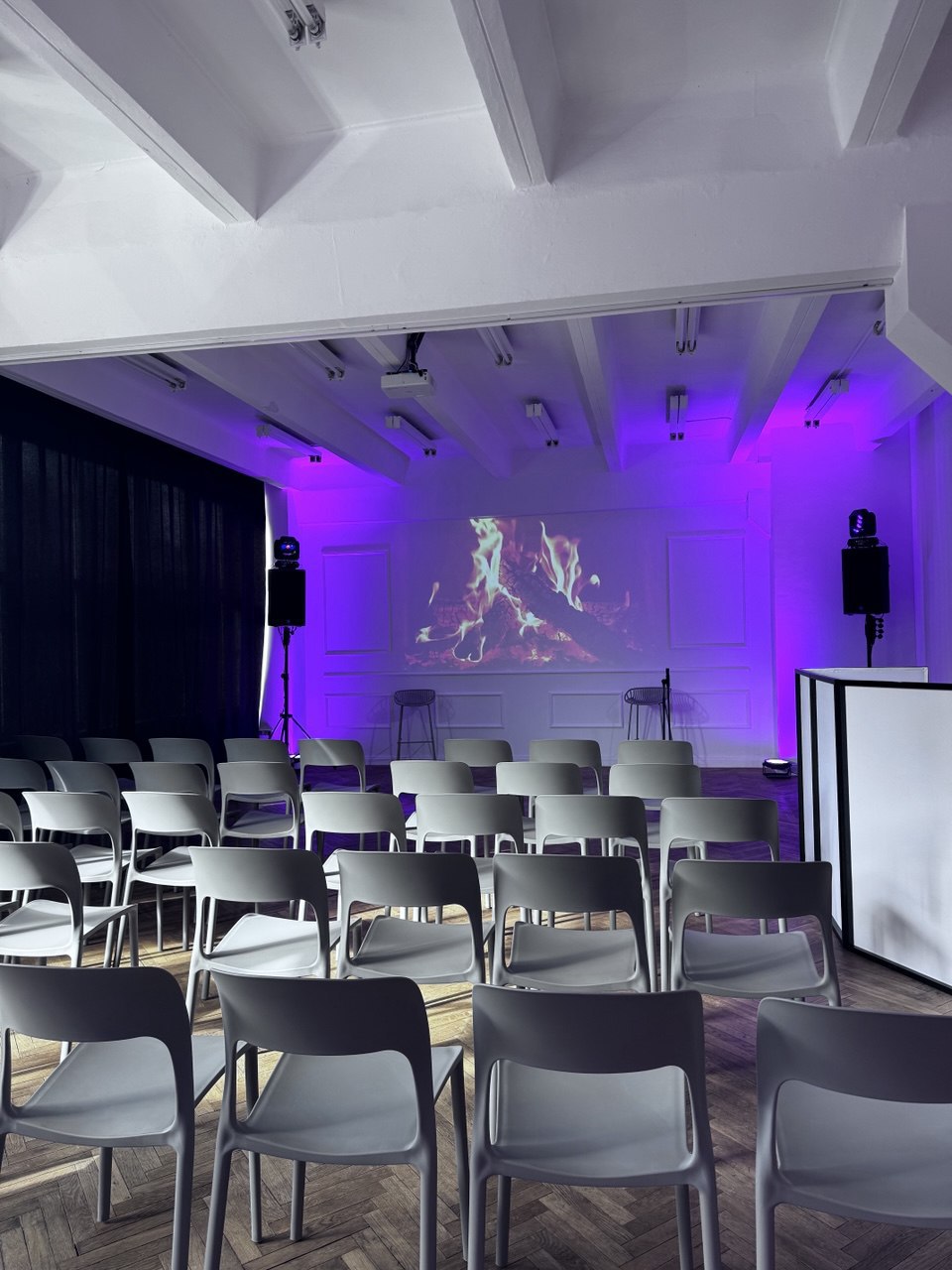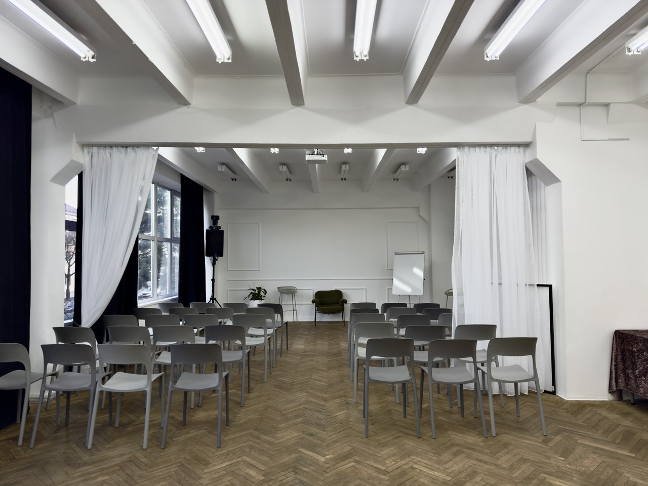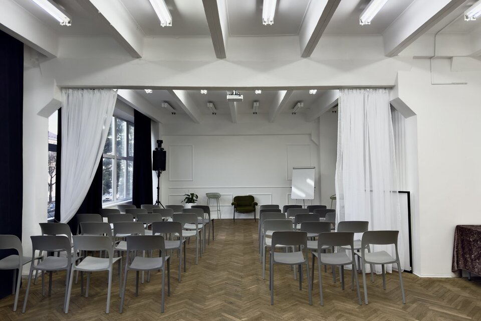 Помещение находится на втором этаже 4-х этажного здания в центре Минска (ст.м. Первомайская). Светлый зал с панорамными окнами и видом на уютную Красноармейскую улицу. Пространство включает входную зону (гардероб), зону для кофе-брейка и основной зал непосредственно для мероприятий площадью 90 кв.м. Ивент-площадка выгодно отличается уютной обстановкой, где вы можете перемещать мебель на свое усмотрение. Есть удобное рабочее место для звукорежиссера/диджея.