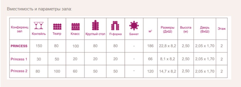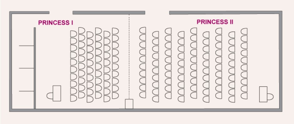 В конференц-зале «Принцесс» можно провести успешные деловые мероприятия, встречи, семинары, лекции и пресс-коференции на 100-200 человек.Специальной перегородкой зал можно разделить на 2 зала – «Принцесс 1» (1/3 зала) и «Принцесс 2» (2/3 зала «Принцесс»).В каждой секции имеются:— встроенный экран,— колонки,— мультимедийный проектор, прикрепленный к потолку,— модемный выход,— телефонная линия.