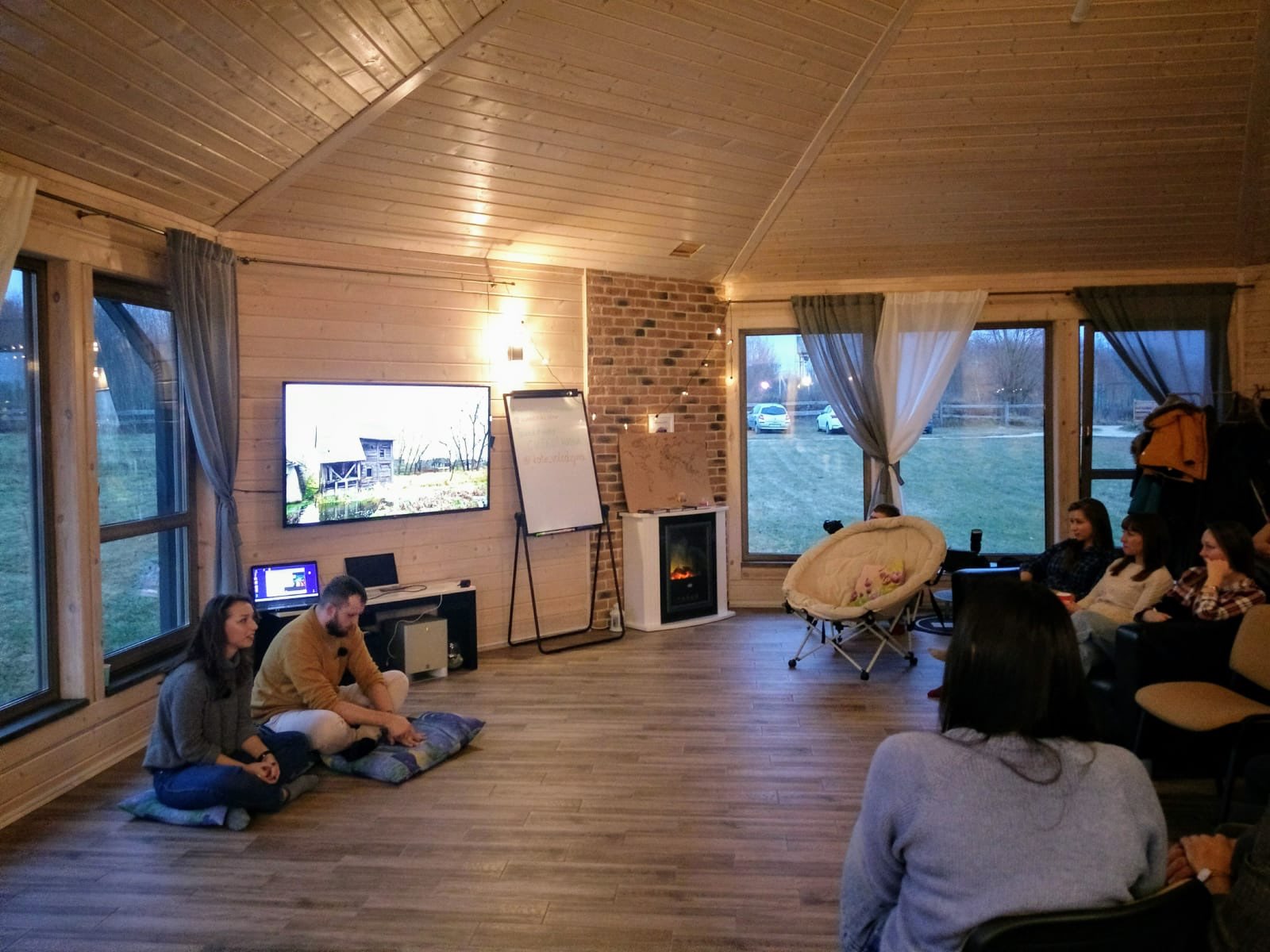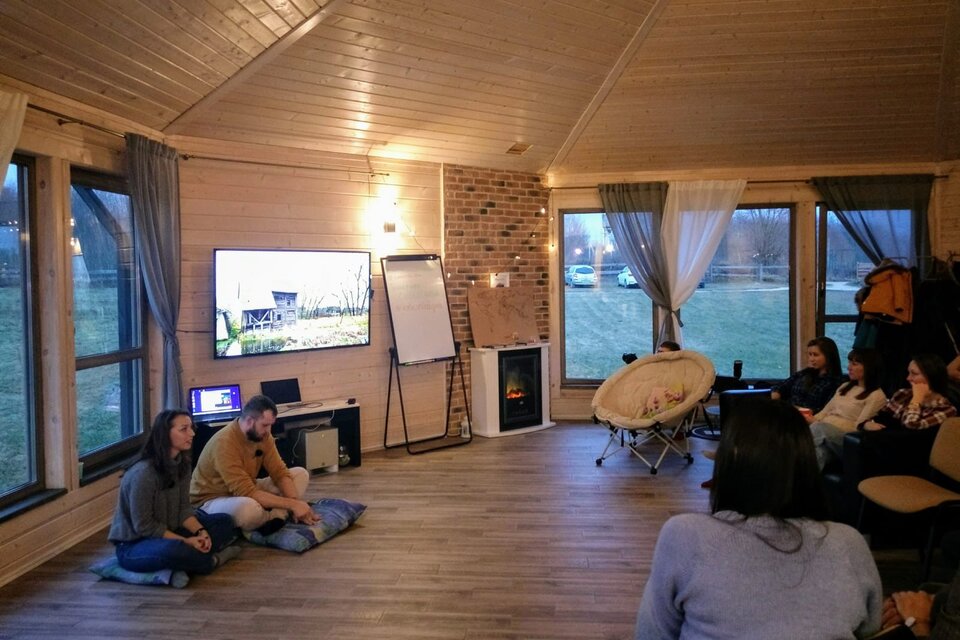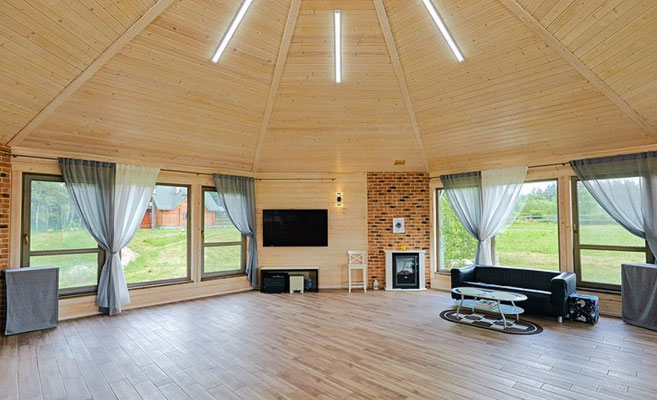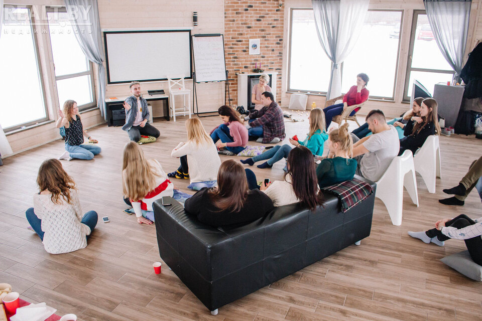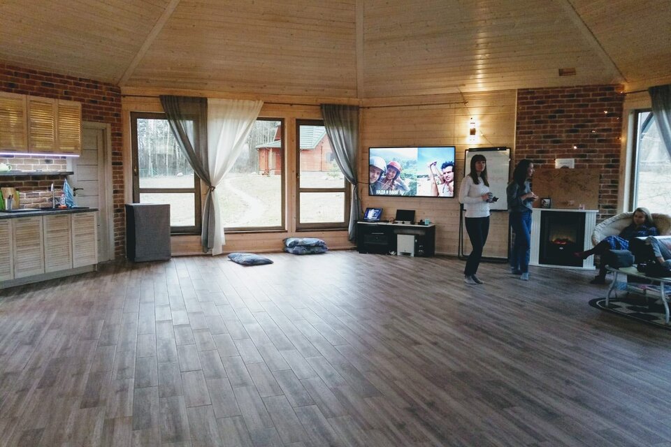 Восьмигранный Зал площадью 80 м.кв. среди природы в непосредственной близости от Минска представляет новое пространство для свежих мыслей и творческих идей! Четыре стены со окнами в пол дают возможность прочуствовать единение с природой. Цивилизованный комфорт обеспечен благодаря тёплому полу, миникухне, санузлу, и разнообразному освещению - от уютного теплого до делового ярко-белого. Имеются магнитно-маркерная доска, экран для проектора, кожаный диван и 30 стульев. На улице есть мангал для барбекю. Зал подходит для проведения командо-образующих тренингов, мозговых штурмов, выездных семинаров, мастер-классов, презентаций, фото-сессий, детских праздников и зимнего семейного досуга.