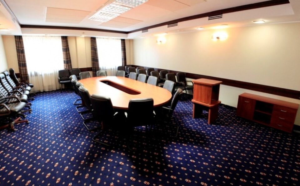 Зал переговоров идеально подходит для закрытых встреч. В центре комнаты расположен овальный стол, за которым могут разместиться до 16 человек. Возможна «театральная» расстановка кресел, что позволяет увеличить вместимость комнаты до 35 человек.Во время проведения мероприятий возможна организация кофе-брейков, бизнес-ланчей, ужинов и фуршетов в ресторане, баре и кафе гостиницы.
