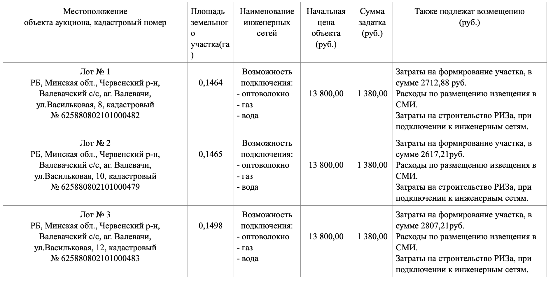 Аукцион состоится 16 декабря 2025 года в здании сельского исполнительного комитета по адресу: Минская область, Червенский район, аг. Валевачи, ул. Минская, 15. Начало аукциона в 15.00.