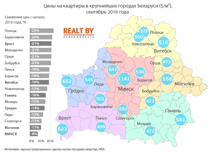 Если говорить о средней стоимости проданных квартир в Бресте, то на конец сентября она составляла 623 $/м2. В Барановичах и Пинске эти показатели равнялись 501 $/м2 и 499 $/м2, соответственно. По соотношению между средним уровнем доходов населения и ценами на квартиры все города брестского региона не выбиваются из общереспубликанской массы — 1,5 — 1,6 средней заработной платы за 1 м2. Лидером в стране ожидаемо стал Минск — 2,2 средние заработные платы за 1 «квадрат».