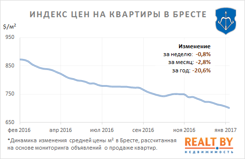 Гродно: 702 $/м2 (- 0,3% за неделю);