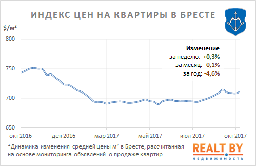 Средняя цена предложения в объявлениях о продаже квартир в Бресте на минувшей неделе выросла на 0,3% и составила 711 $/м2.