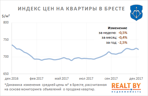 Средняя цена предложения в объявлениях о продаже квартир в Бресте на минувшей неделе снизилась на 0,5% и составила 721 $/м2.