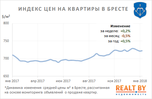 Средняя цена предложения в объявлениях о продаже квартир в Бресте на минувшей неделе выросла на 0,2% и составила 723 $/м2.