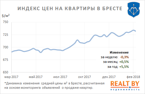 Средняя цена предложения в объявлениях о продаже квартир в Бресте на минувшей неделе снизилась на 0,3% и составила 732 $/м2.