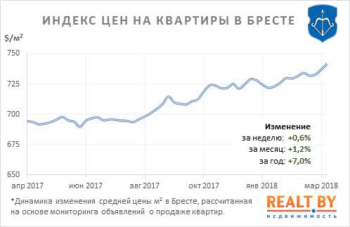 Средняя цена предложения в объявлениях о продаже квартир в Бресте на минувшей неделе выросла на 0,6% и составила 742 $/м2.