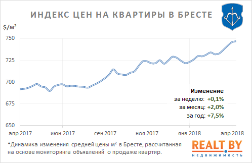 Средняя цена предложения в объявлениях о продаже квартир в Бресте на минувшей неделе выросла на 0,1% и составила 747 $/м2.
