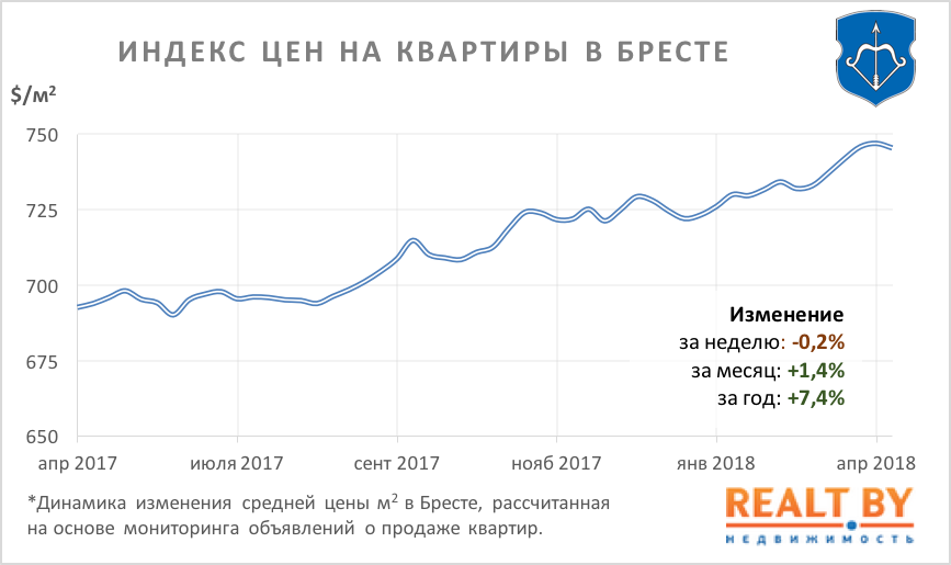 Средняя цена предложения в объявлениях о продаже квартир в Бресте на минувшей неделе снизилась на 0,2% и составила 745 $/м2.