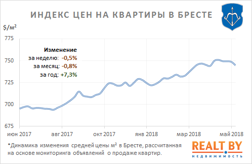 Средняя цена предложения в объявлениях о продаже квартир в Бресте на минувшей неделе снизилась на 0,5% и составила 745 $/м2.