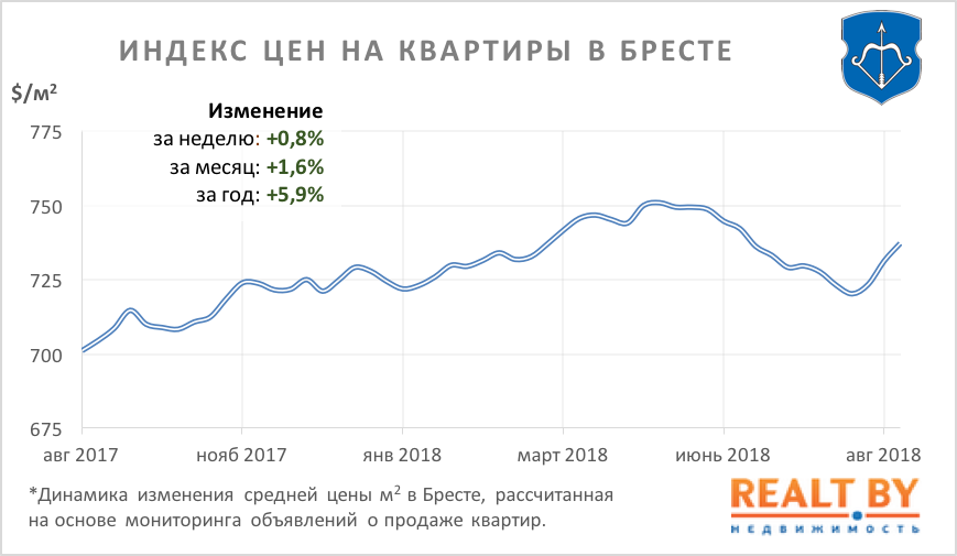 Средняя цена предложения в объявлениях о продаже квартир в Бресте на минувшей неделе выросла на 0,8% и составила 737 $/м2.