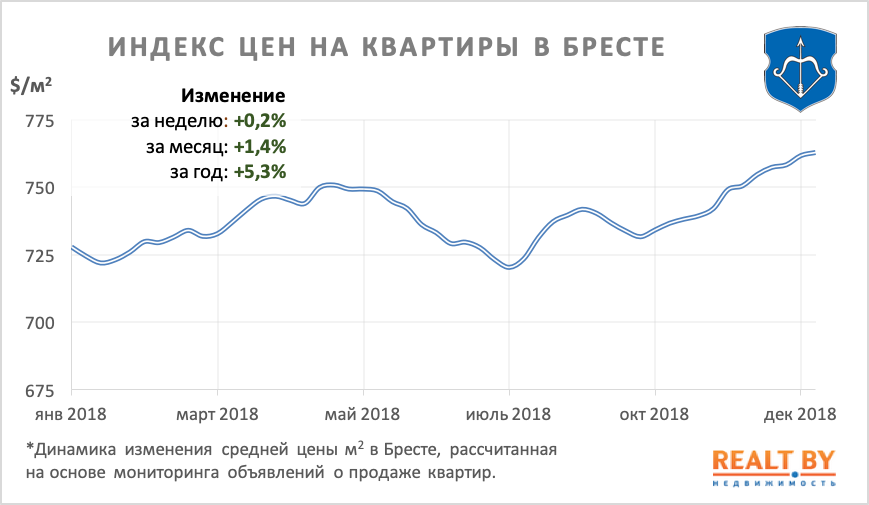 Средняя цена предложения в объявлениях о продаже квартир в Бресте на минувшей неделе выросла на 0,2% и составила 763 $/м2.