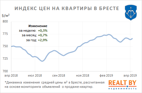 Средняя цена предложения в объявлениях о продаже квартир в Бресте на минувшей неделе выросла на 0,3% и составила 767 $/м2.