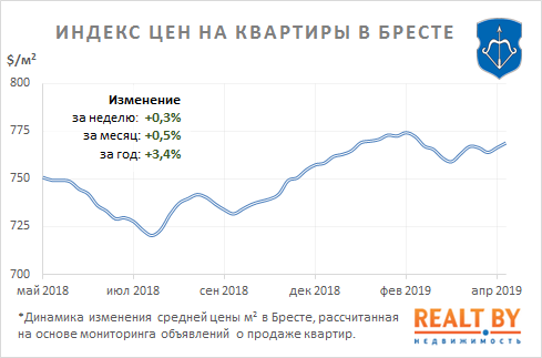 Средняя цена предложения в объявлениях о продаже квартир в Бресте на минувшей неделе выросла на 0,3% и составила 769 $/м2.