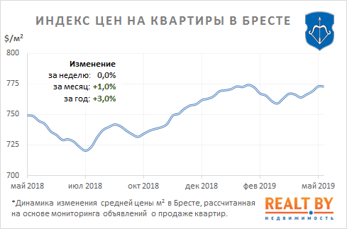 Средняя цена предложения в объявлениях о продаже квартир в Бресте на минувшей неделе не изменилась и составила 773 $/м2.