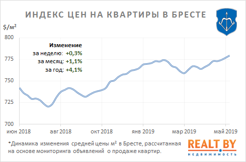 Средняя цена предложения в объявлениях о продаже квартир в Бресте на минувшей неделе выросла на 0,3% и составила 780 $/м2.