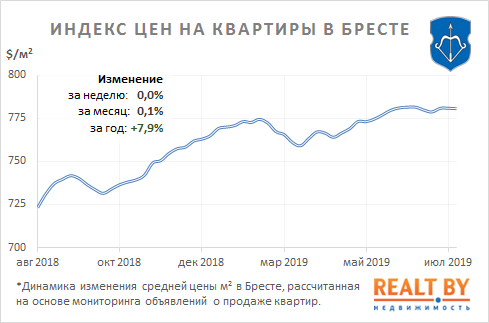 Средняя цена предложения в объявлениях о продаже квартир в Бресте на минувшей неделе не изменилась и составила 781 $/м 2.