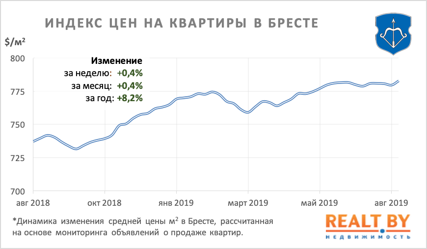 Средняя цена предложения в объявлениях о продаже квартир в Бресте на минувшей неделе выросла на 0,4% и составила 783 $/м2.