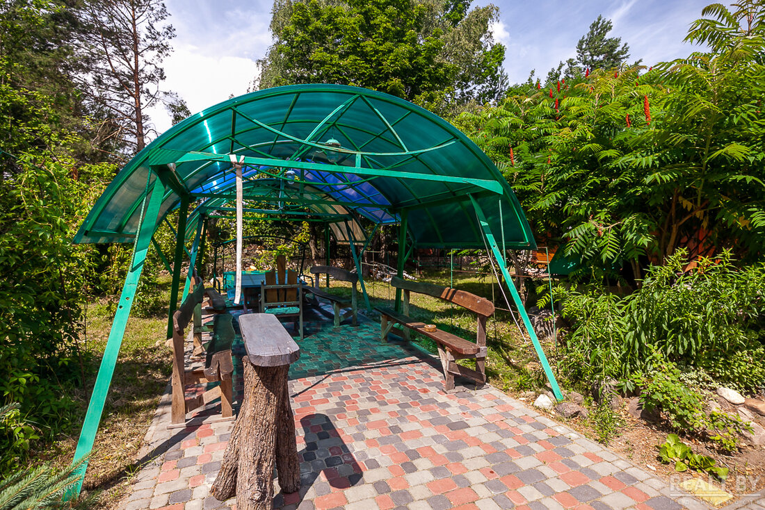 Территория огорожена и благоустроена. Во дворе выложена плитка, построены скамейки и навесы для отдыха, выделена мангальная зона.