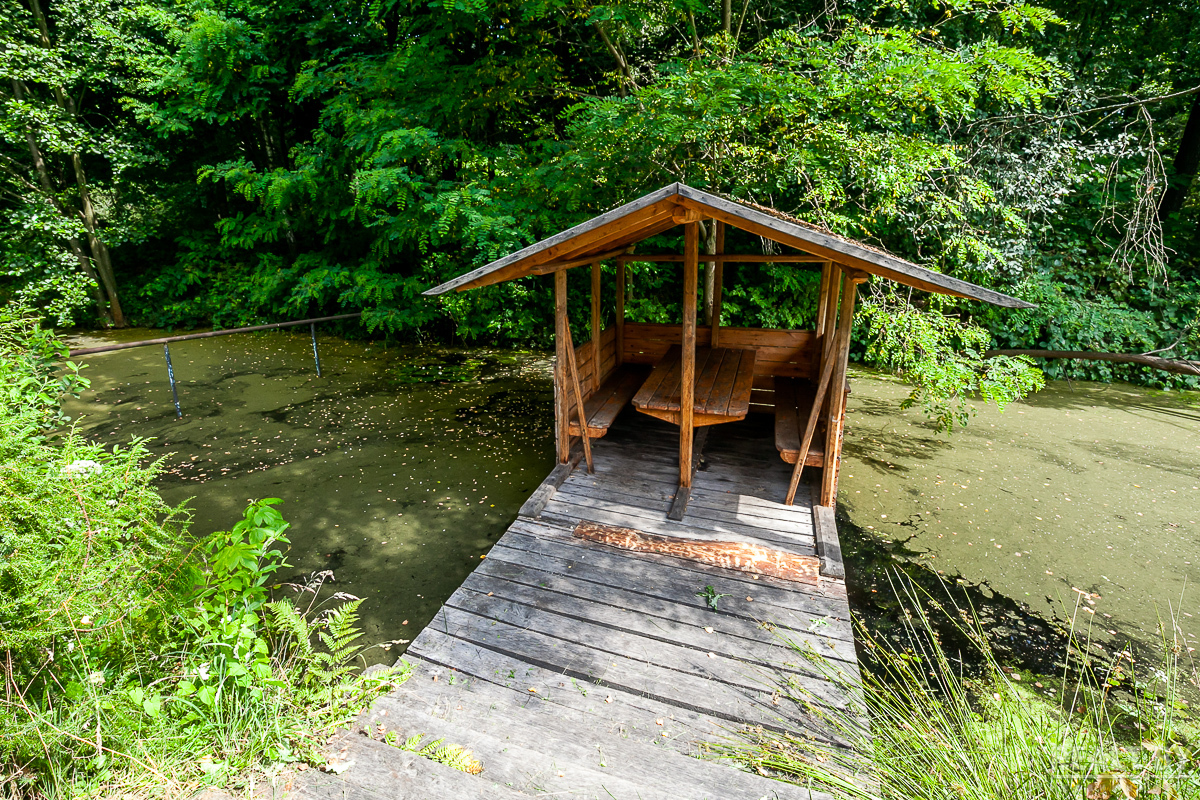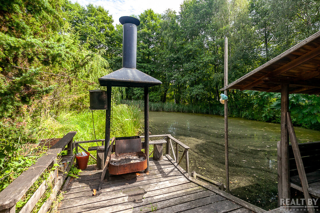 Усадьба отличается тем, что она расположена в лесу, на острове, а вокруг нее — вода, где хорошо ловится рыба. Анатолий говорит, что накануне нашего приезда в Брестском районе прошли ливневые дожди и шквалистые ветры. Вода поднялась, и усадьбу подтопило. Сейчас вода потихоньку уходит.