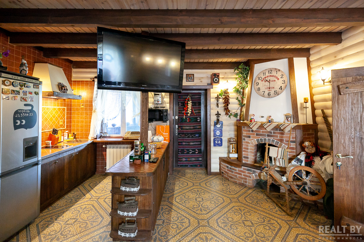 На первом этаже дома находятся большая кухня-столовая, оснащенная дубовой мебелью с барной стойкой и обеденным столом. Здесь есть телевизор, холодильник, вся необходимая бытовая техника.