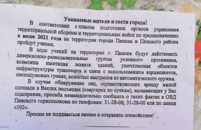 «В соответствии с планом подготовки органов управления территориальной обороны и территориальных войск по предназначению в июне 2021 года на территории города Пинска и Пинского района пройдут учения.