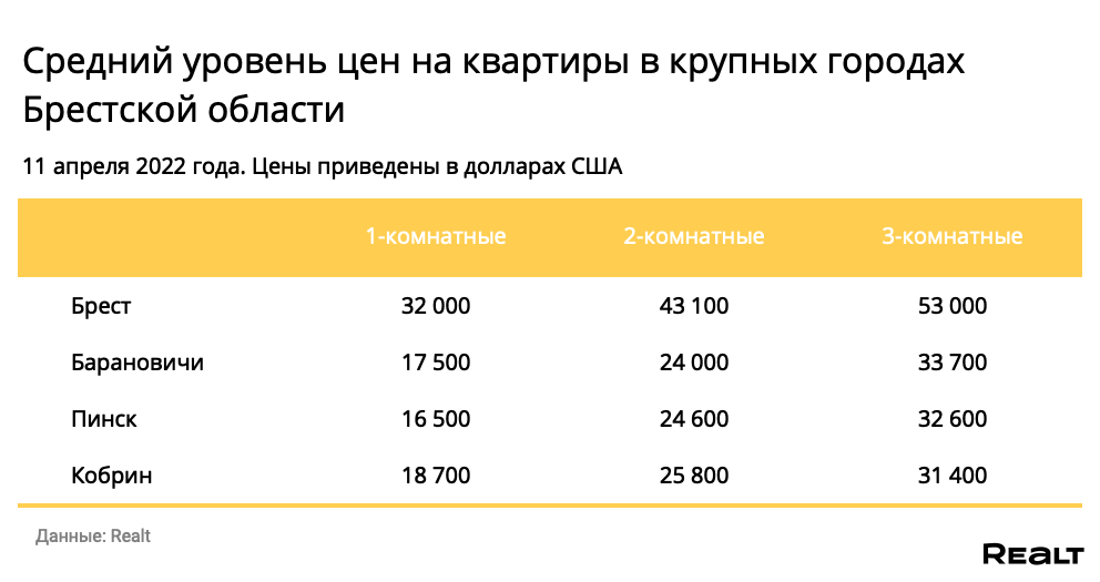 Мониторинг цен предложения квартир в Бресте и городах Брестской области за 4−11 апреля 2022 года