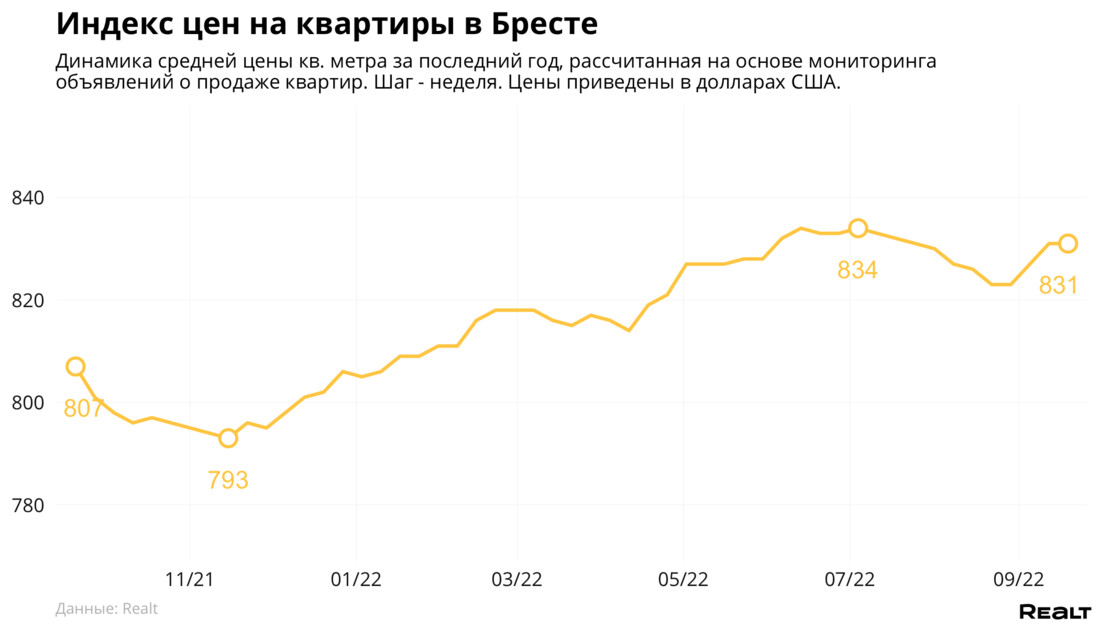 Средняя цена в объявлениях о продаже квартир в Бресте не изменилась и составила 831 $/м2.