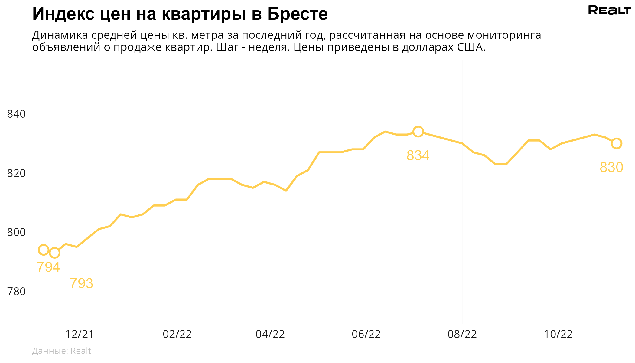 Средняя цена в объявлениях о продаже квартир в Бресте снизилась на 0.2% и составила 830 $/м2.