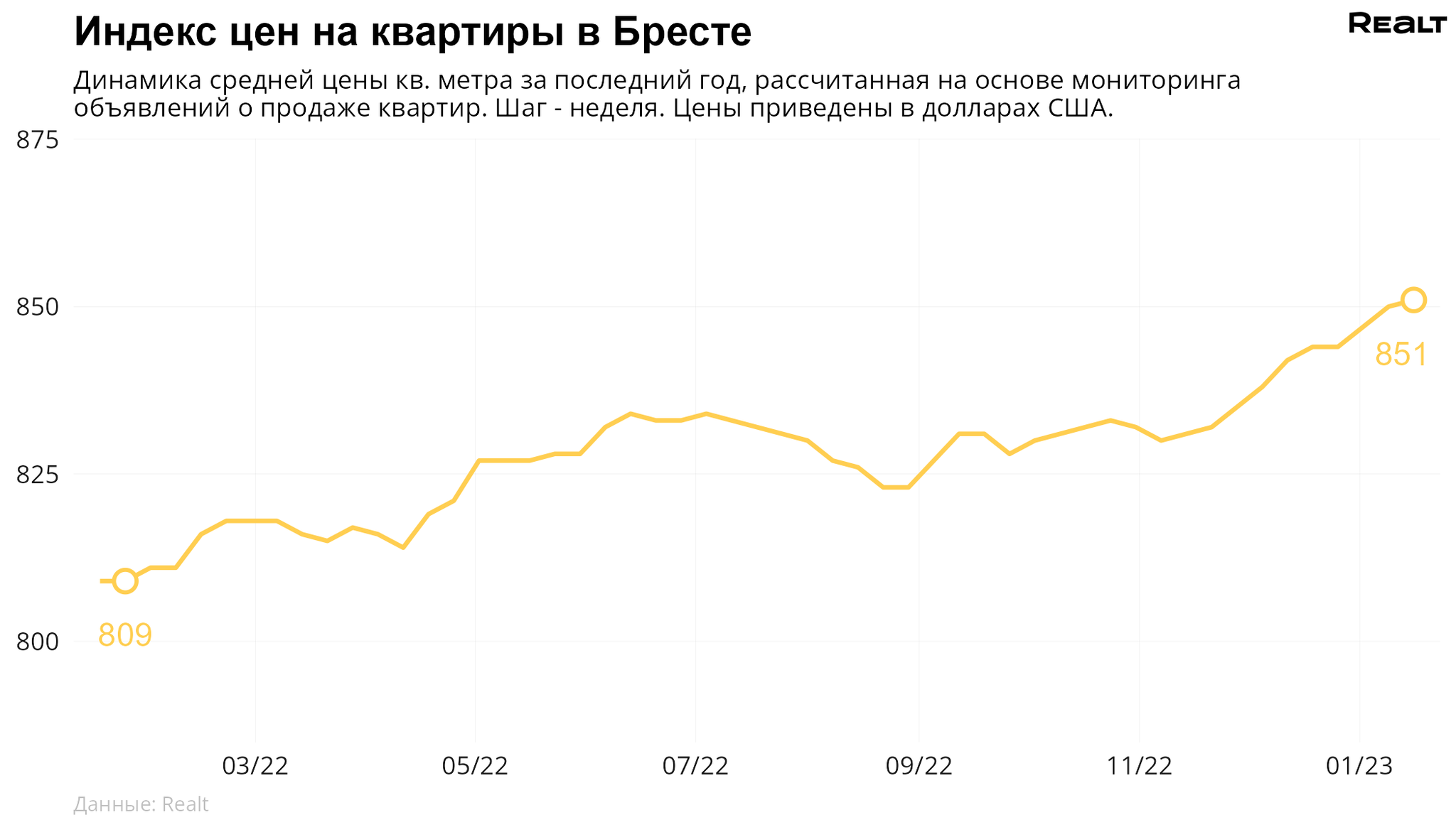 Средняя цена в объявлениях о продаже квартир в Бресте выросла на 0.1% и составила 851 $/м2.