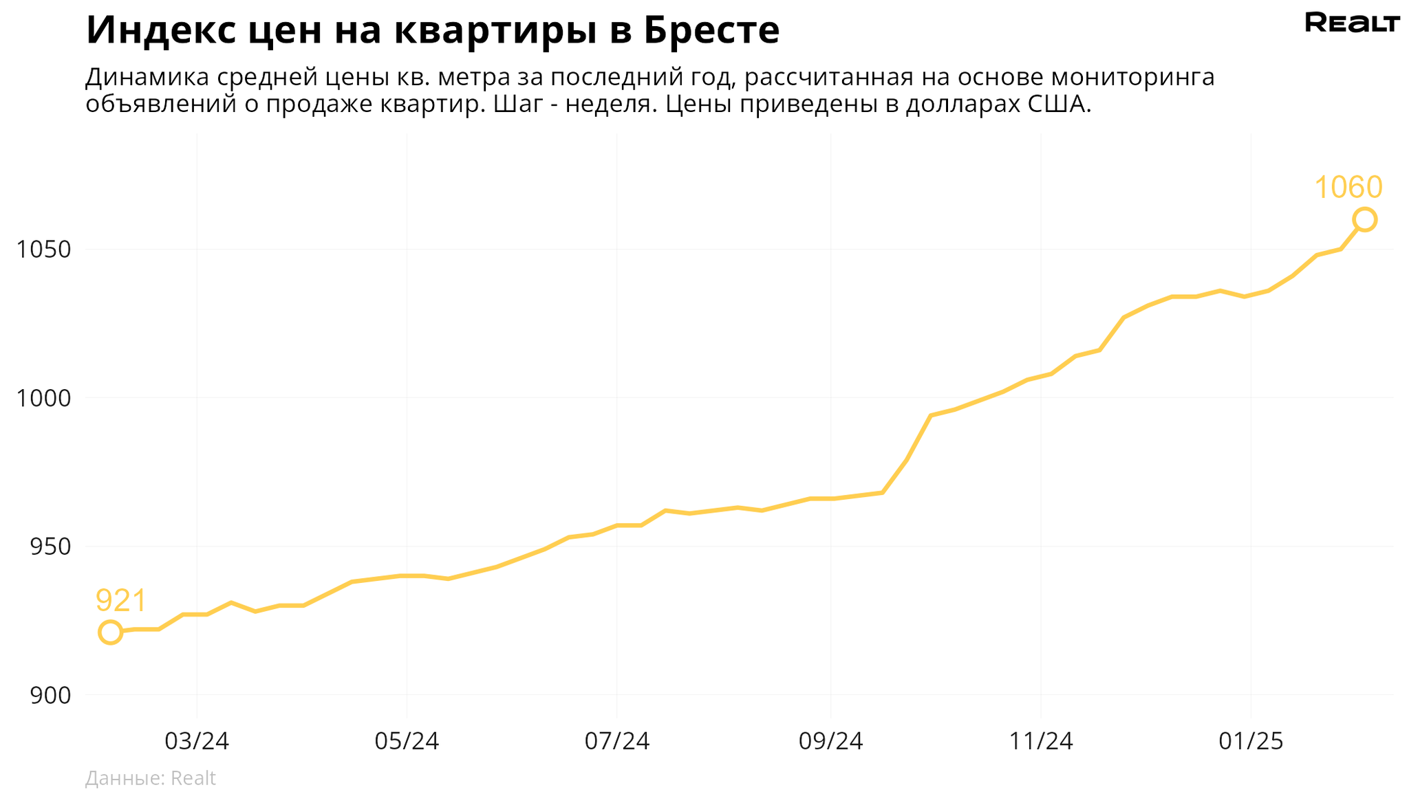 За неделю, c 27 января по 3 февраля 2025 года, средняя цена в объявлениях о продаже квартир в Бресте выросла на 1% и составила 1060 $/м2. При этом количество квартир в продаже увеличилось на 1.3%. Что еще произошло на рынке жилья крупнейших городов Брестской области за семь дней — в материале.