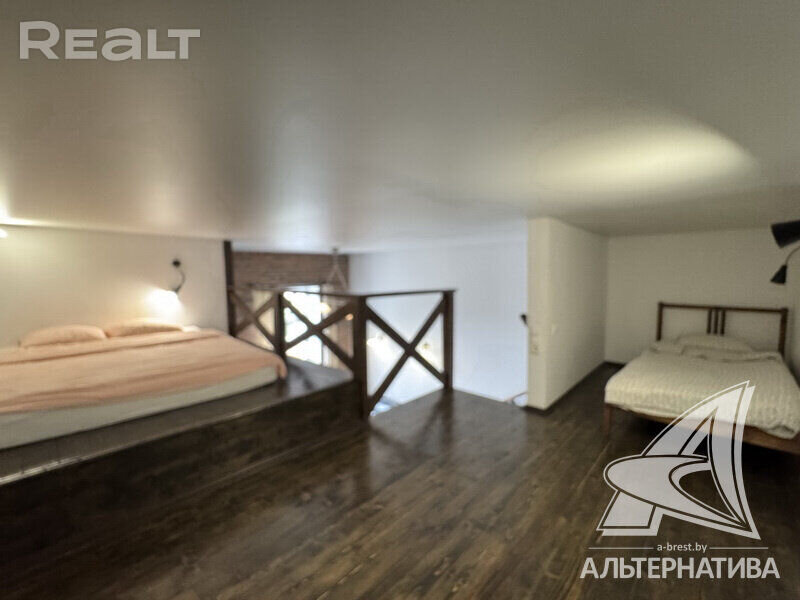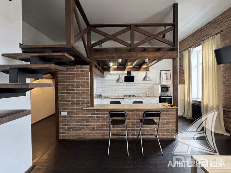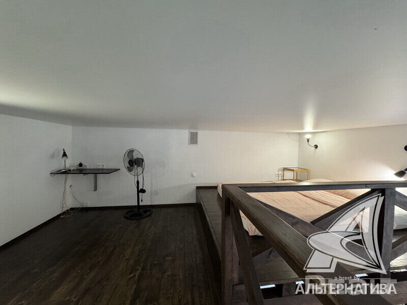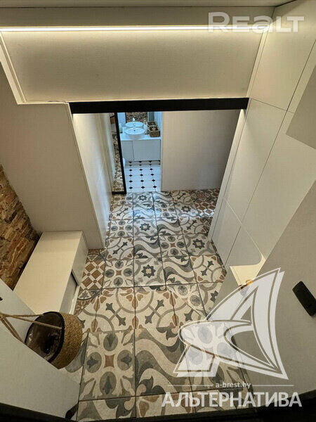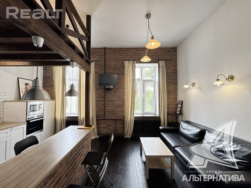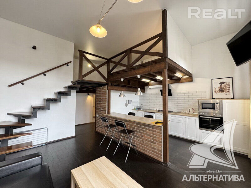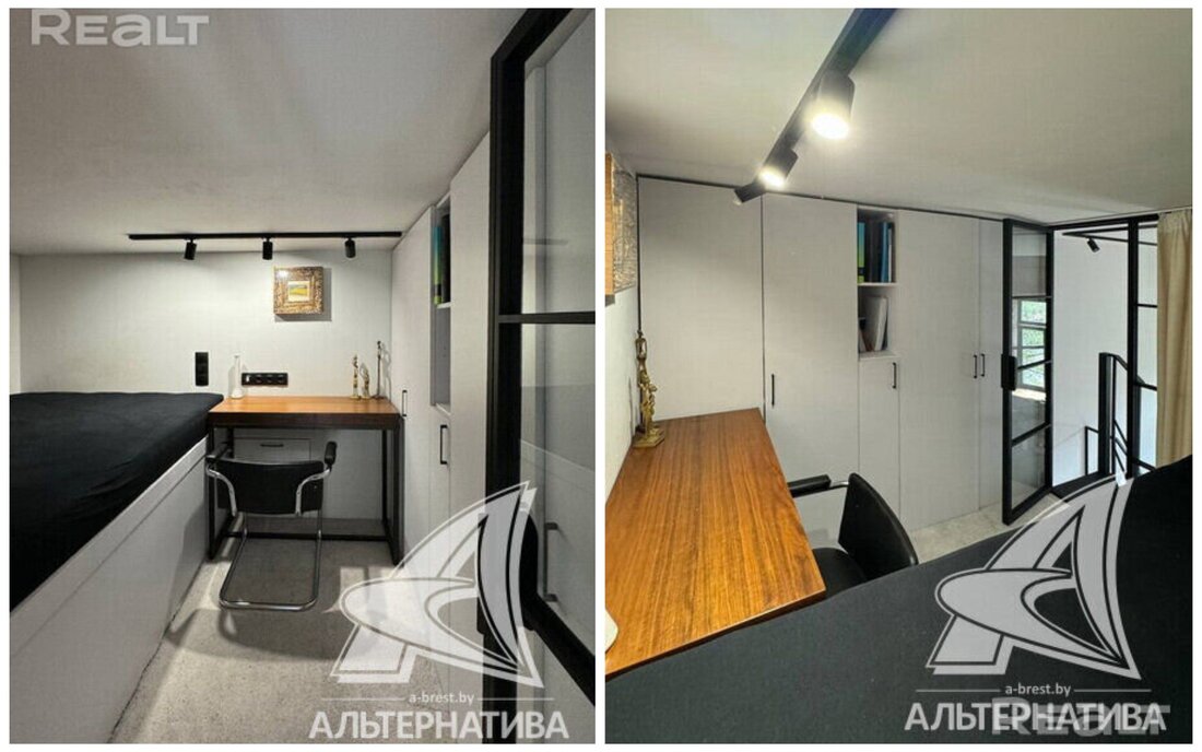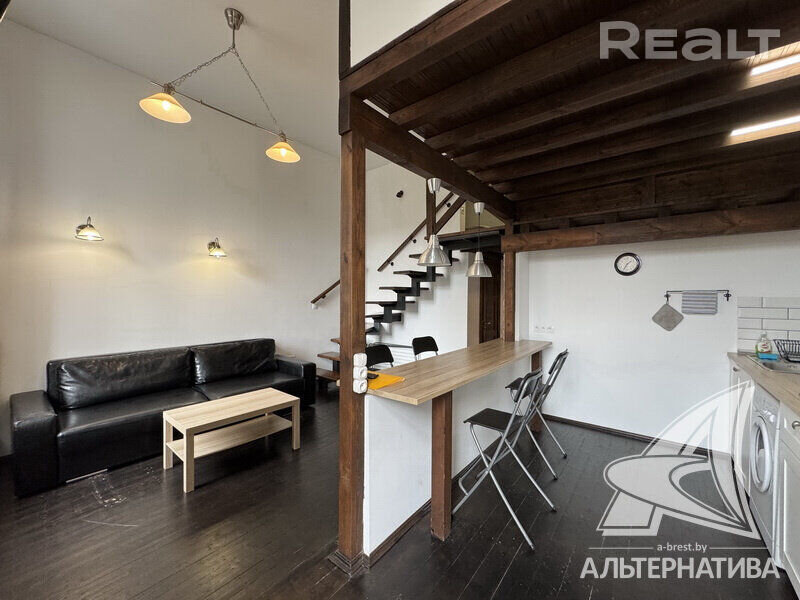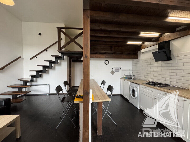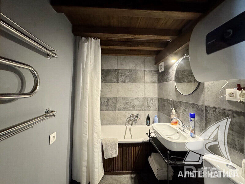 Кухня небольшая и совмещена с коридором. Здесь имеются встроенная мебель, варочная панель, вытяжка, холодильник, смеситель и раковина. Совмещенный санузел идет с душем, туалетом-инсталляцией, встроенной стиральной машиной и бойлером на 50 л.