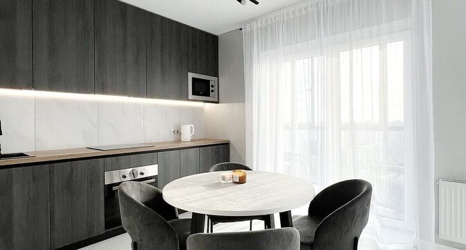 Общая площадь квартиры — 64 квадрата. Жилая — 36 метров. Метраж кухни — 13 квадратов. Между кухней и жилой комнатой — стеклянная перегородка. В гостиной есть выход на французский балкон. Во второй жилой комнате оборудована спальня.