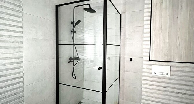 Санузел совмещенный. Установлена душевая кабина. Вся сантехника фирмы Roca. Полы с подогревом. Есть стиральная машина.