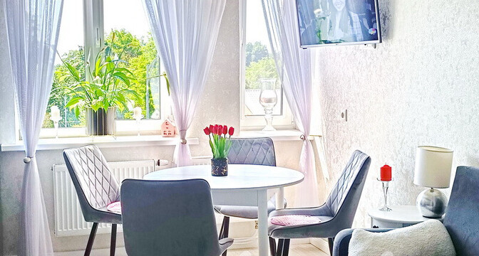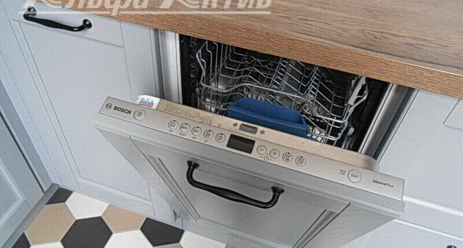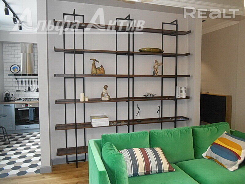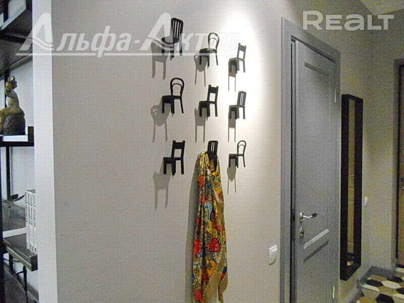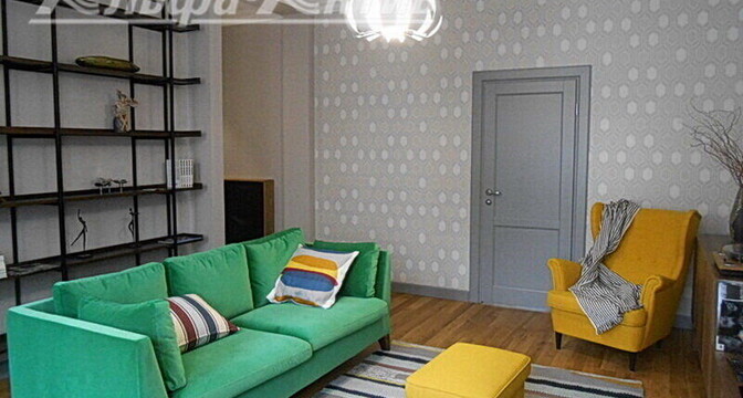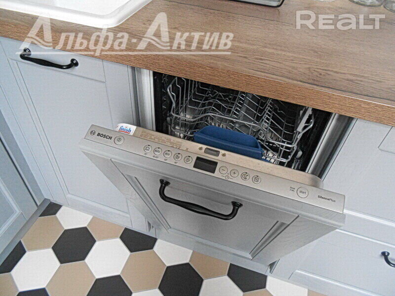 Общая площадь квартиры — 55 квадратов, 40 из них жилые. Площадь кухни — 5 метров. На полу лежит паркетная доска из массива дуба, потолки выкрашены краской. Двери — из массива ольхи. Встроенная кухня — из массива ясеня. Есть посудомойка.