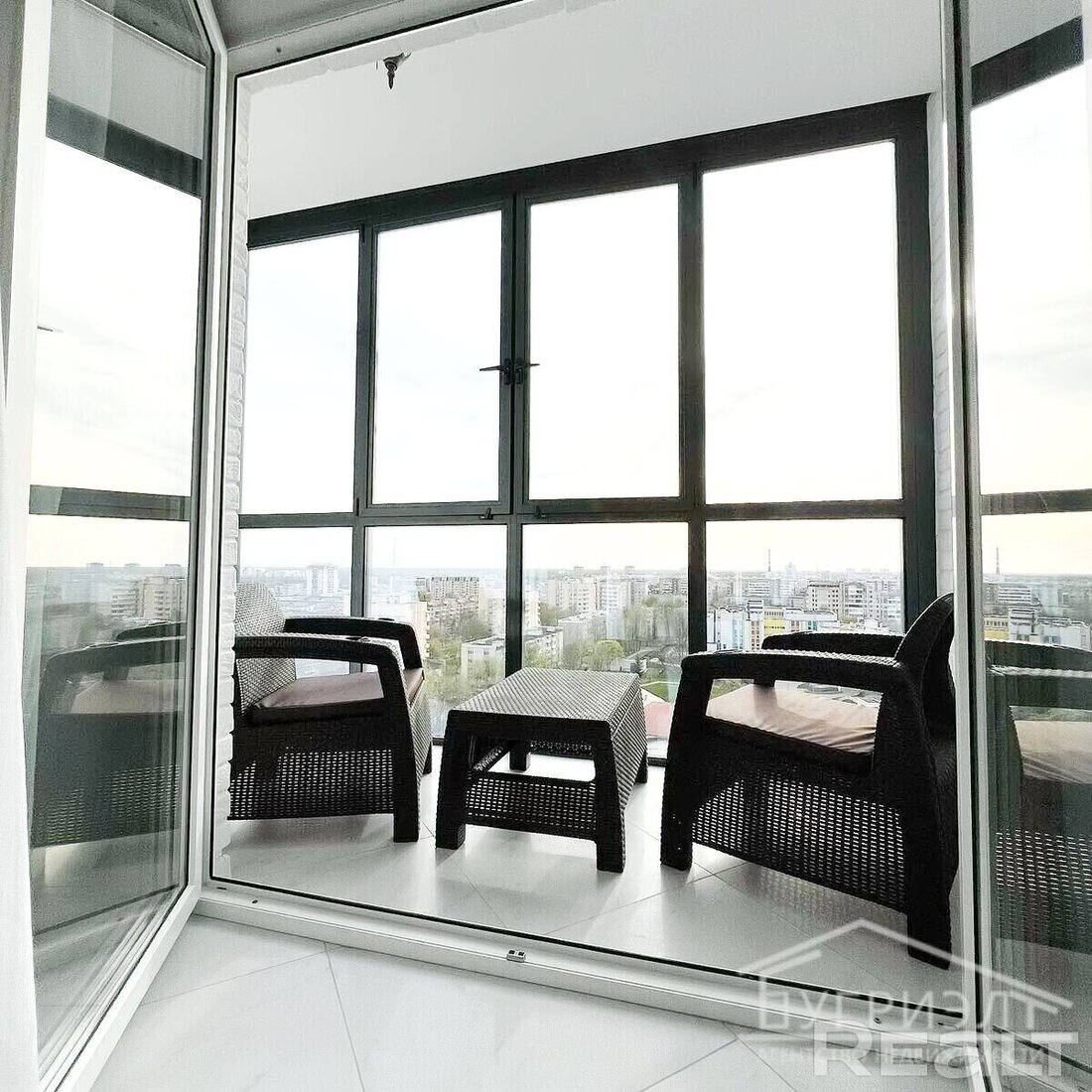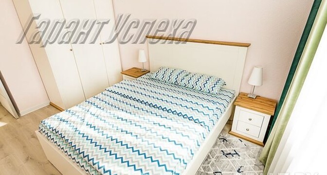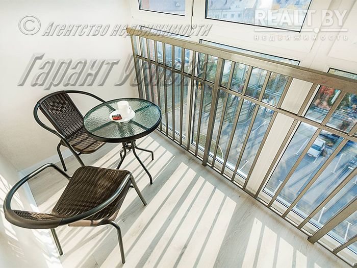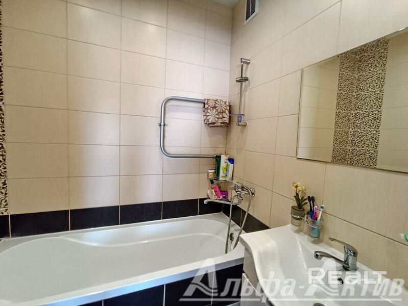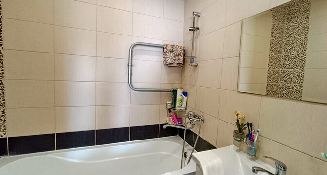 На полу лежит ламинат и плитка, потолки натяжные. Санузел раздельный. Установлена ванна. Есть застекленная лоджия.
