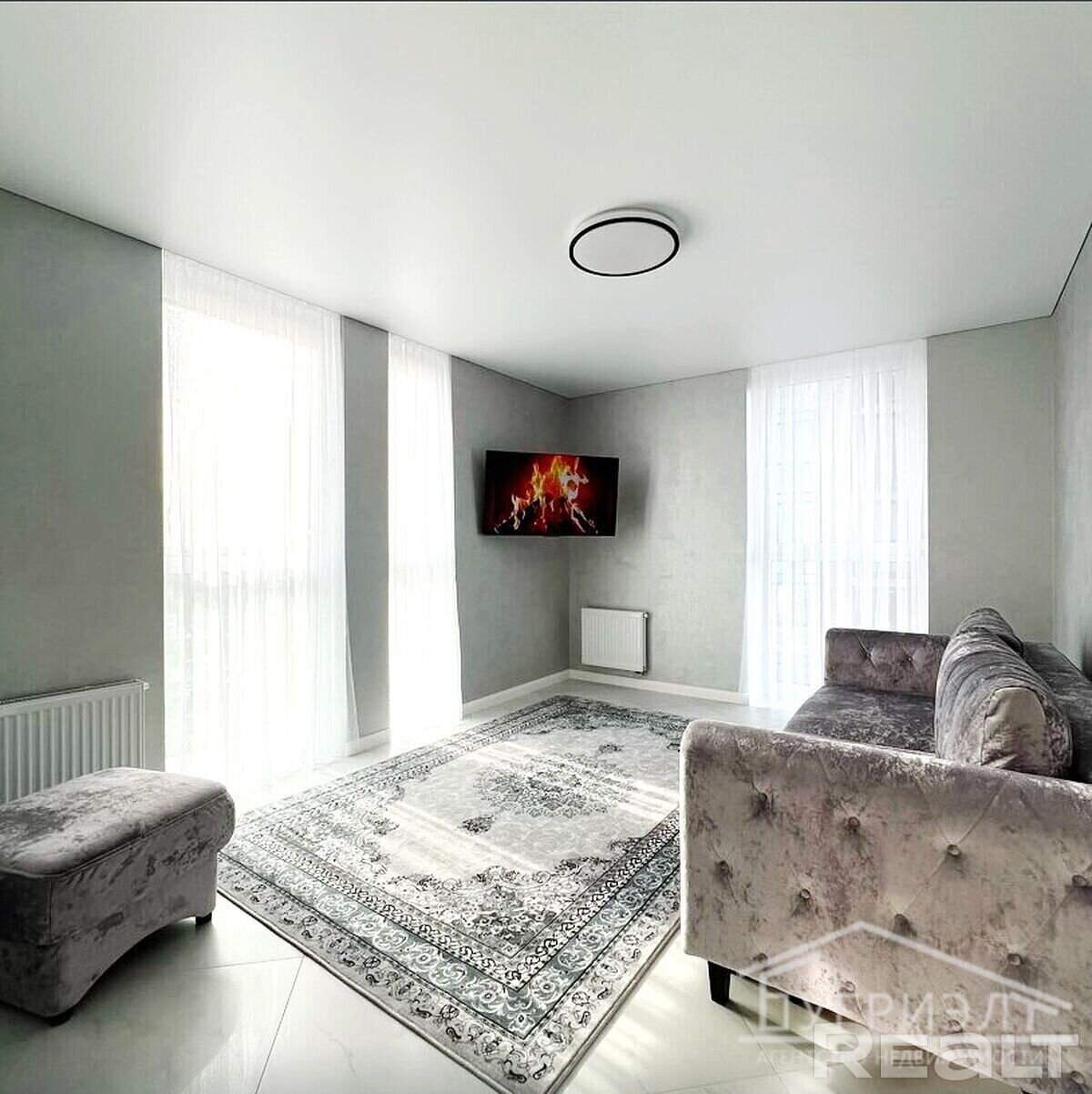 Общая площадь квартиры — 48 квадратов, жилая — 25 метров, кухня — 11 метров. Все комнаты, включая кухню, изолированные. В квартире выполнен современный ремонт в светлых оттенках. В кухне есть выход на застекленную лоджию с панорамным остеклением. В гостиной — несколько окон. В совмещенном санузле установлена душевая.