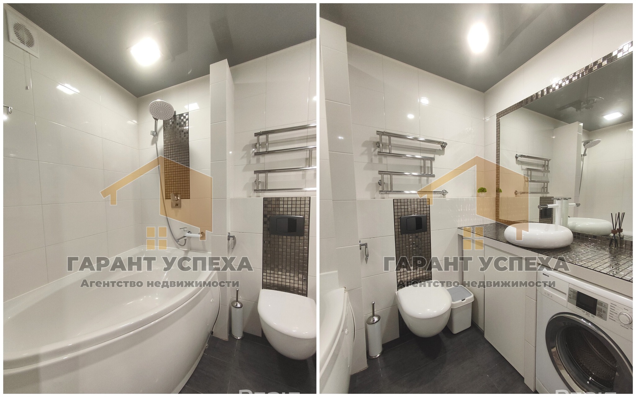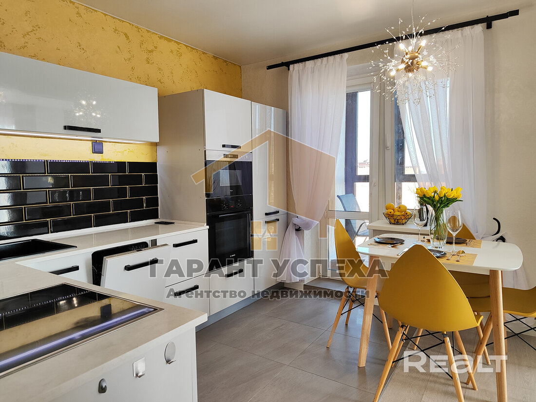 Квартира готова к проживанию. Тут сделан хороший светлый ремонт с яркими акцентами. Кухня и комната совмещены. Установлена бытовая техника — холодильник Electrolux, посудомоечная машина, вытяжка, духовой шкаф, варочная поверхность Bosch. Из кухни можно выйти на застекленную лоджию. Тут обустроена небольшая зона отдыха.