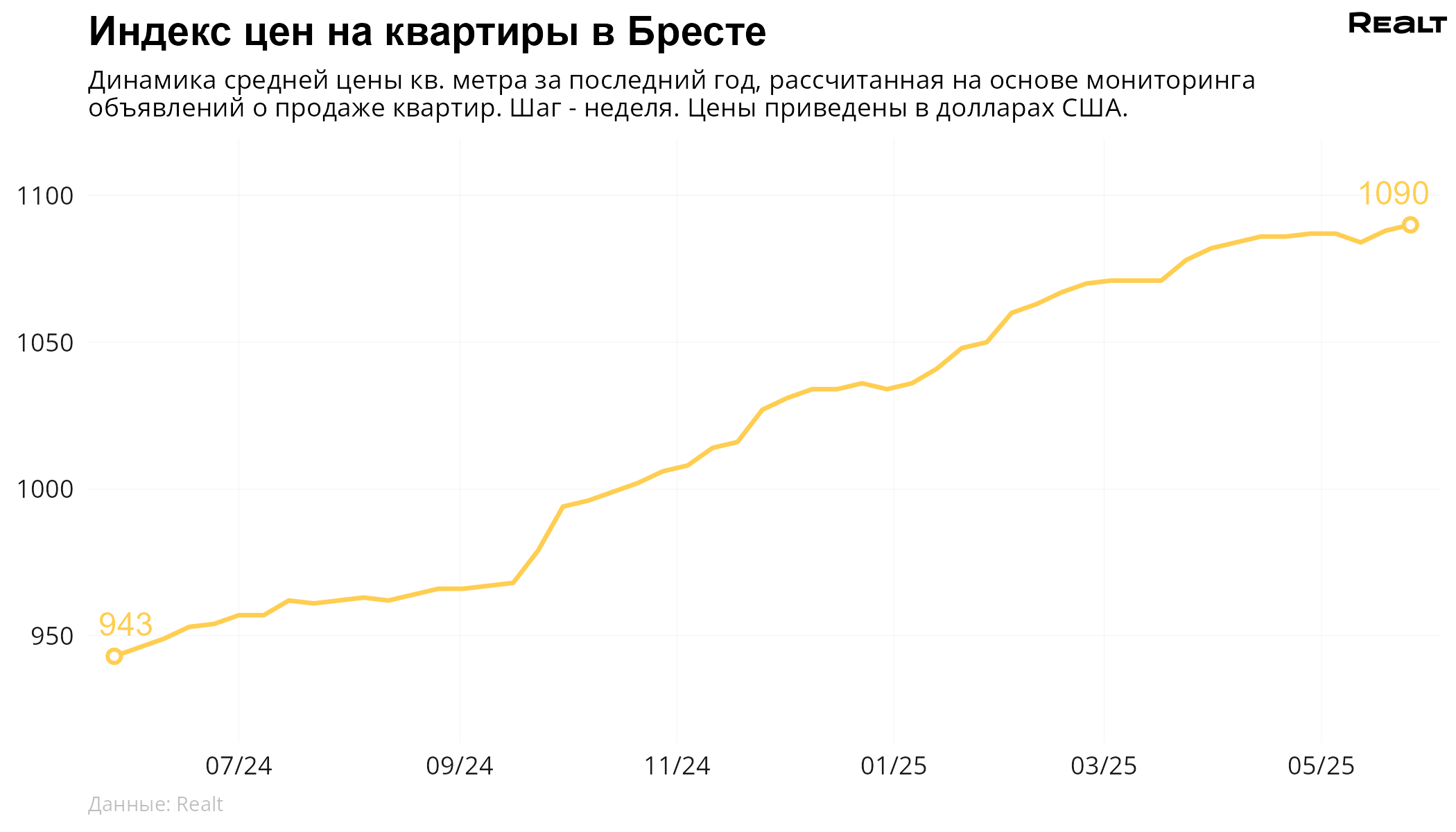 За неделю, с 19 по 26 мая 2025 года, средняя цена в объявлениях о продаже квартир в Бресте выросла на 0.2% и составила 1090 $/м2. При этом количество квартир в продаже уменьшилось на 0.2%. Что еще произошло на рынке жилья крупнейших городов Брестской области за семь дней — в материале.