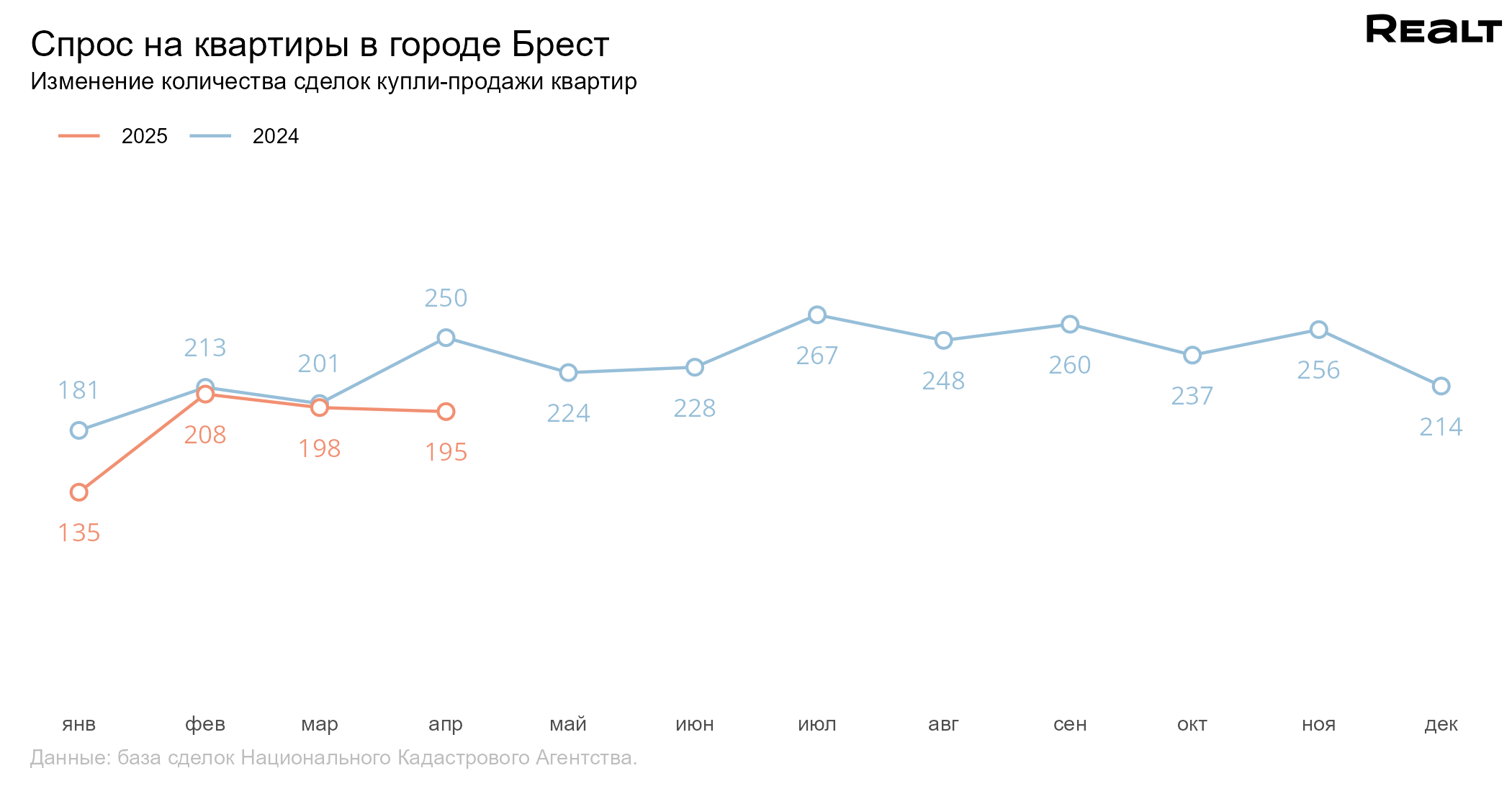 За апрель в Бресте заключили 195 сделок купли-продажи квартир, что на 1.5% меньше, чем в предыдущем месяце. Однако, несмотря на снижение, текущий спрос один из самых высоких для середины весны. Подробности и что еще происходит на рынке квартир Бреста — в аналитике Realt.