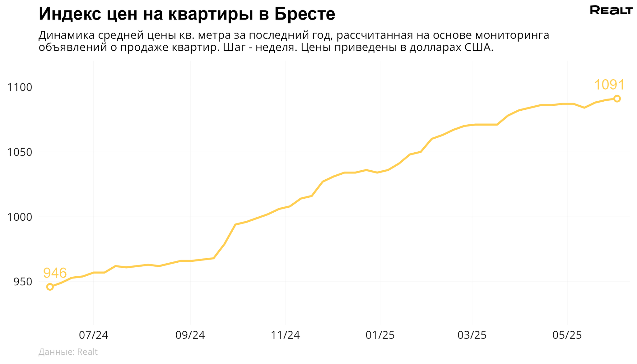 За неделю, c 26 мая по 2 июня 2025 года, средняя цена в объявлениях о продаже квартир в Бресте выросла на 0.1% и составила 1091 $/м2. При этом количество квартир в продаже уменьшилось на 0.6%. Что еще произошло на рынке жилья крупнейших городов Брестской области за семь дней — в материале.