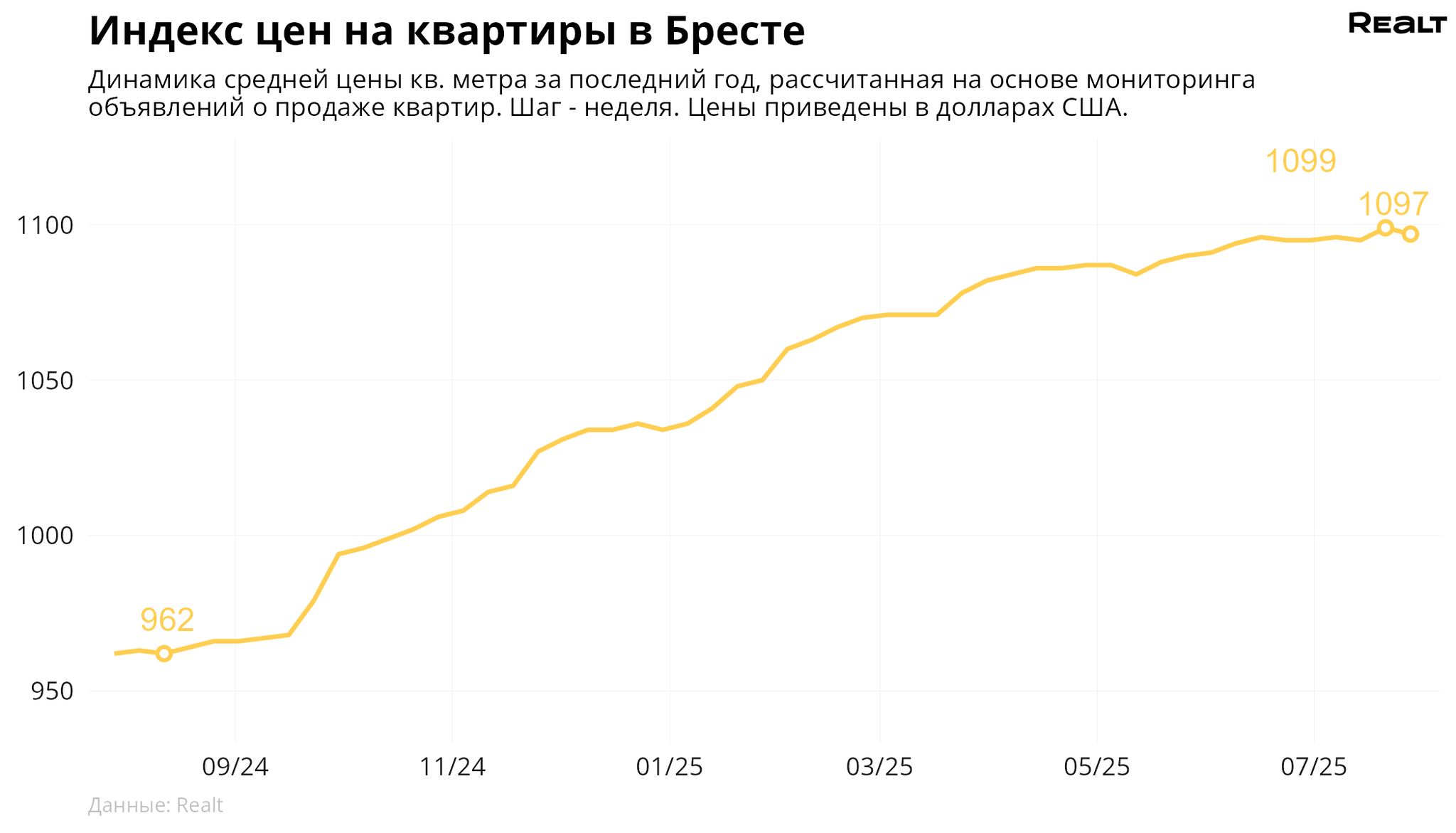 За неделю, с 21 по 28 июля 2025 года, средняя цена в объявлениях о продаже квартир в Бресте снизилась на 0.2% и составила 1097 $/м2. При этом количество квартир в продаже уменьшилось на 0.4%. Что еще произошло на рынке жилья крупнейших городов Брестской области за семь дней — в материале.