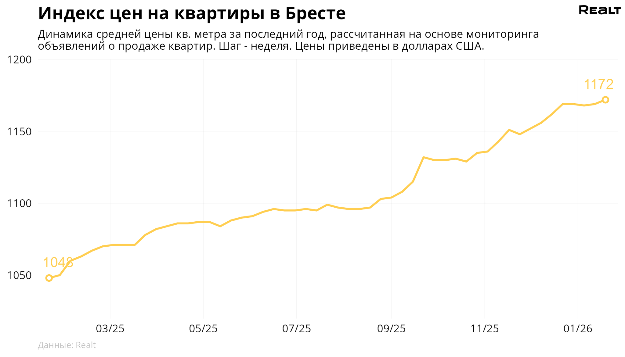 За неделю, с 12 по 19 января 2026 года, средняя цена в объявлениях о продаже квартир в Бресте выросла на 0.3% и составила 1172 $/м2. При этом количество квартир в продаже увеличилось на 0.4%. Что еще произошло на рынке жилья крупнейших городов Брестской области за семь дней — в материале.
