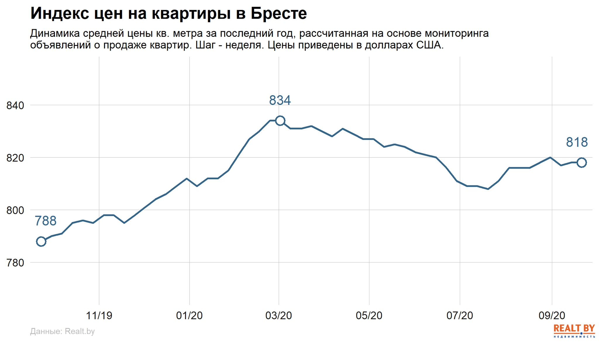 Средняя цена в объявлениях о продаже квартир в Бресте не изменилась и составила 818 $/м2.