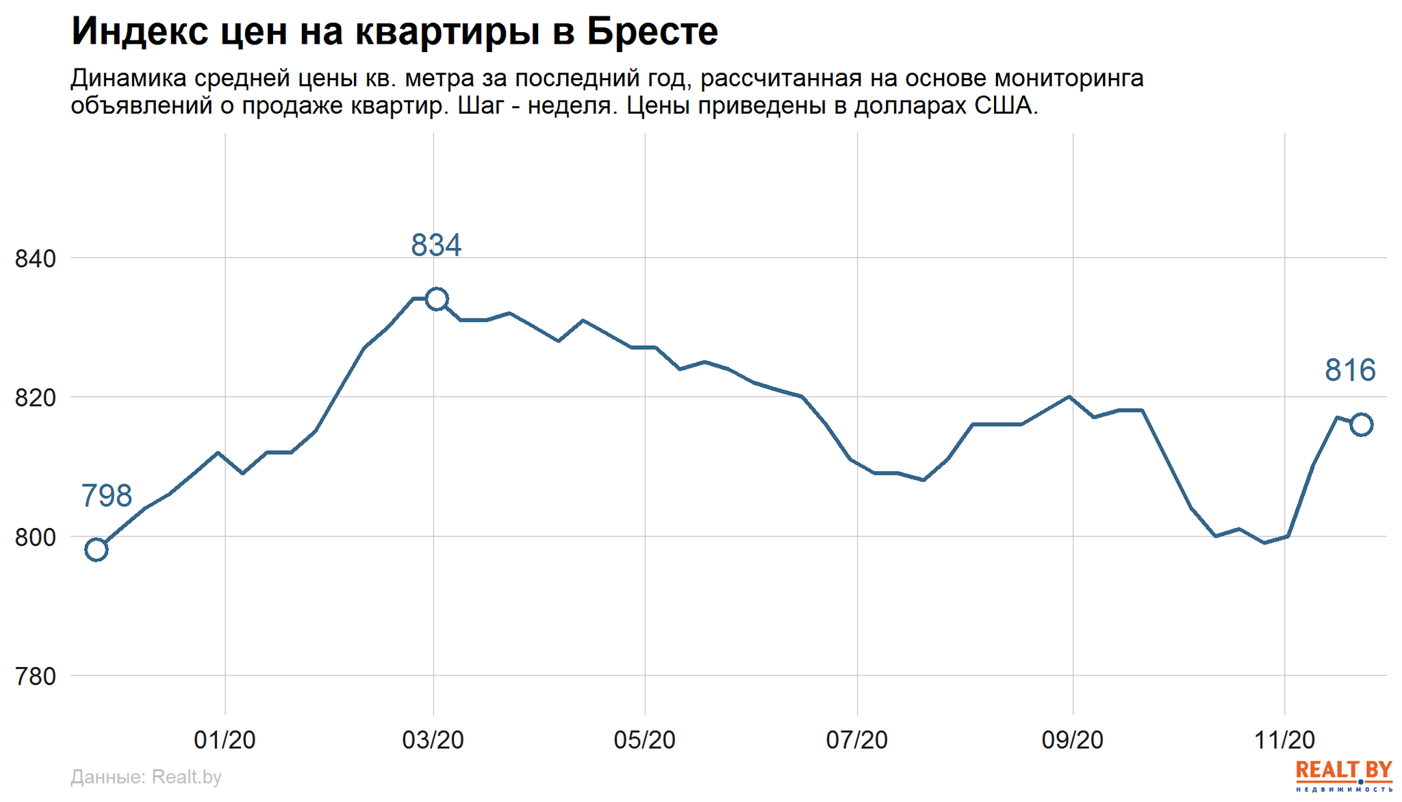 Средняя цена в объявлениях о продаже квартир в Бресте снизилась на 0.1% и составила 816 $/м2.